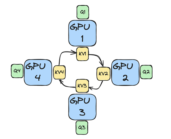 下面以一个包含 4 个 GPU 的系统为例,展示 Ring Attention 中多个计算节点之间的连接关系。需要注意的是,为了便于理解,此处暂时忽略 Causal Mask 的影响。