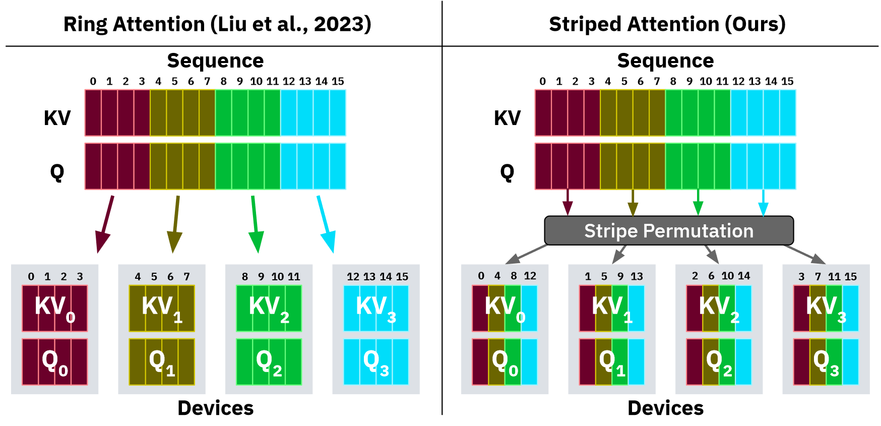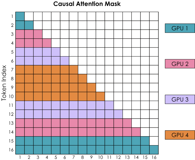 Striped Attention 的作者将 Naive 方案中按序列直接分块切割的方式改变为用 Stride 抽取 Token 后组合成一个 Block,下面给出一个例子: