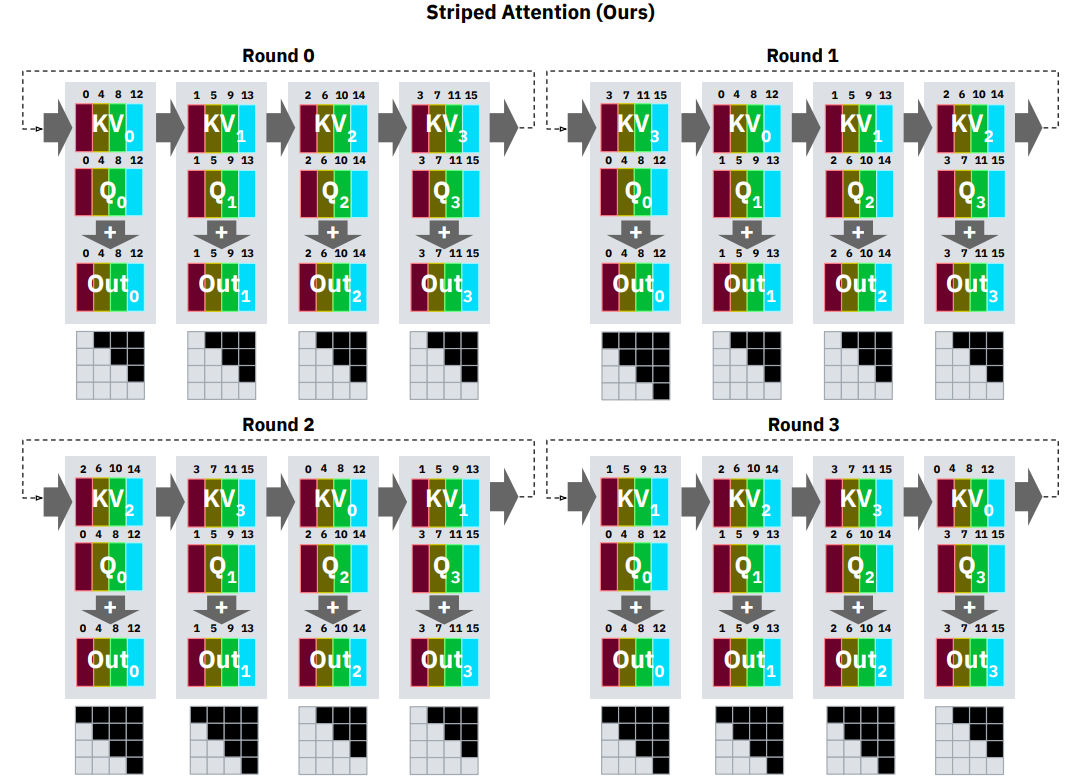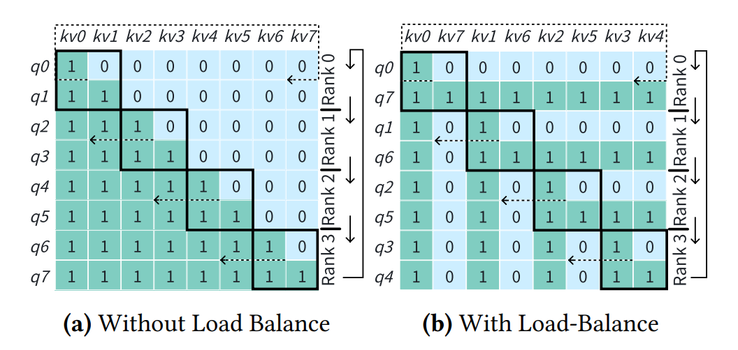 我们很容易发现,由于 Query Block 是按行直接均匀切分后放置在不同计算节点中的,第一个计算节点上需要实际完成的计算只有 Block A,其他计算都是无效的。这样的切分方式无法将所有计算任务均匀分配到各个节点,因此后续有更多研究探索如何尽可能均衡地进行任务分配。